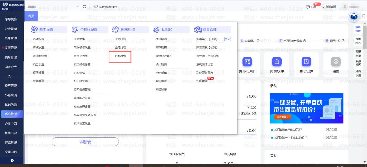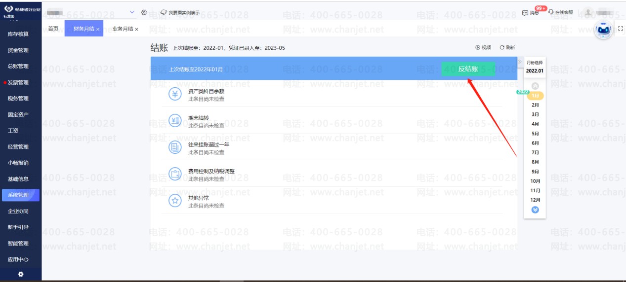 如果需要变更已月结月份的财务数据,可以操作反月结