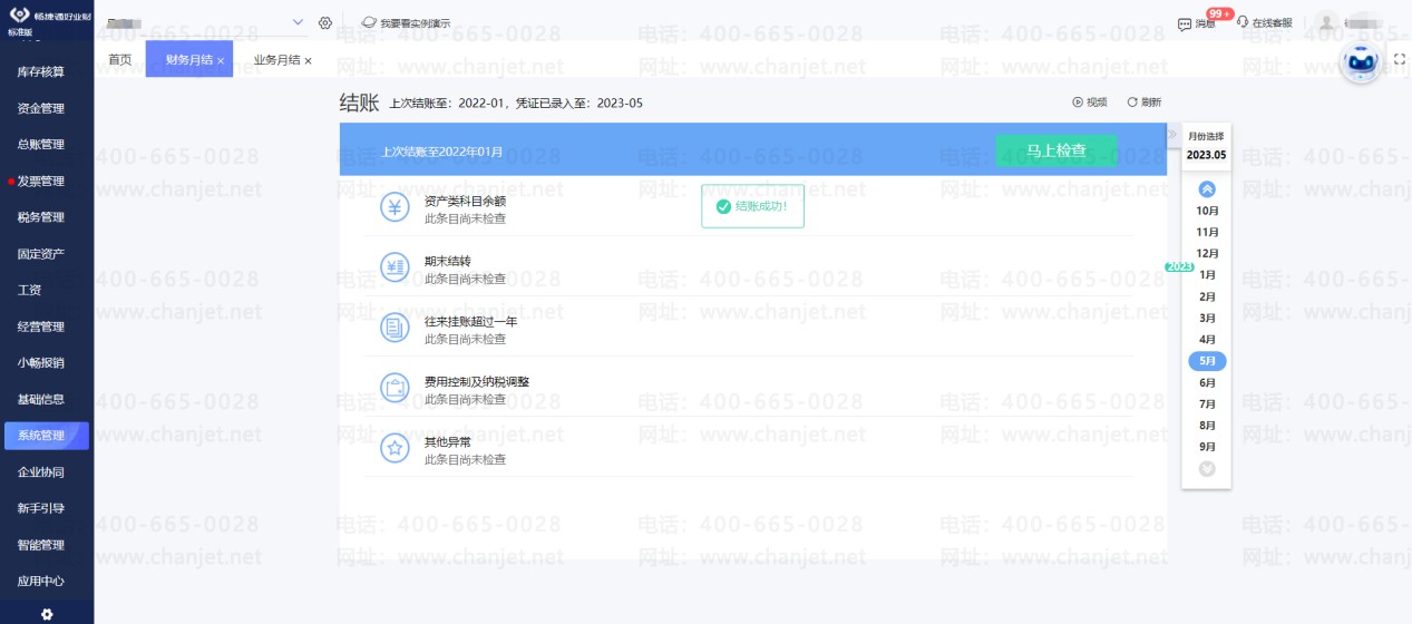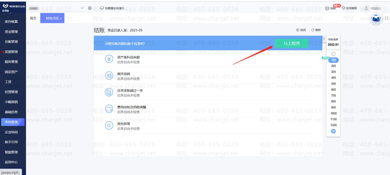 注:点击马上检查后,不合格的数据会有提示,可根据提示进行调整。财务月结之前必须先操作完成业务月结