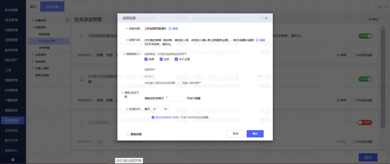 在维护往来信息的时候,设置客户的【收款条件】,系统根据单据的收款期限,每天都会发给业务员,告知业务员负责的销货单(其他收入单),有xx笔最长超期xx天未收款。