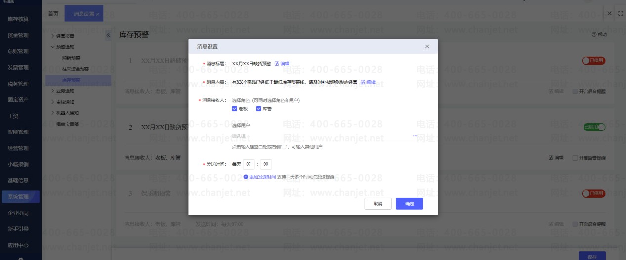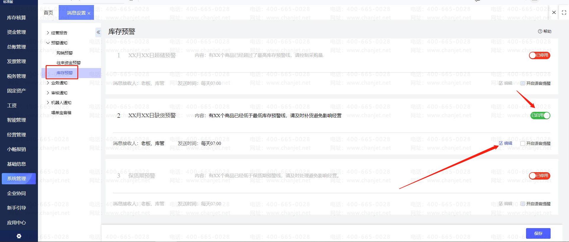 1. 点击【系统管理】-【消息设置】-【预警通知】,缺货提醒打开并且保存。(【消息标题】、【消息内容】、【消息接收人】和【发送时间】都可以手动更改)