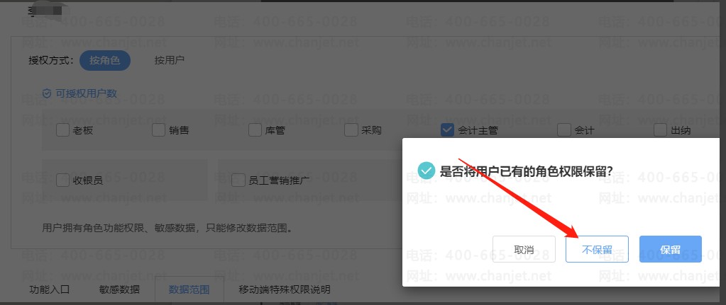 点击【保留】按钮,会把这个用户之前的角色权限保留,可以自行选择给这个用户授权此角色之外的其他权限,点击【不保留】就不会保留之前角色的权限,可以自行设置,该用户需要什么权限。