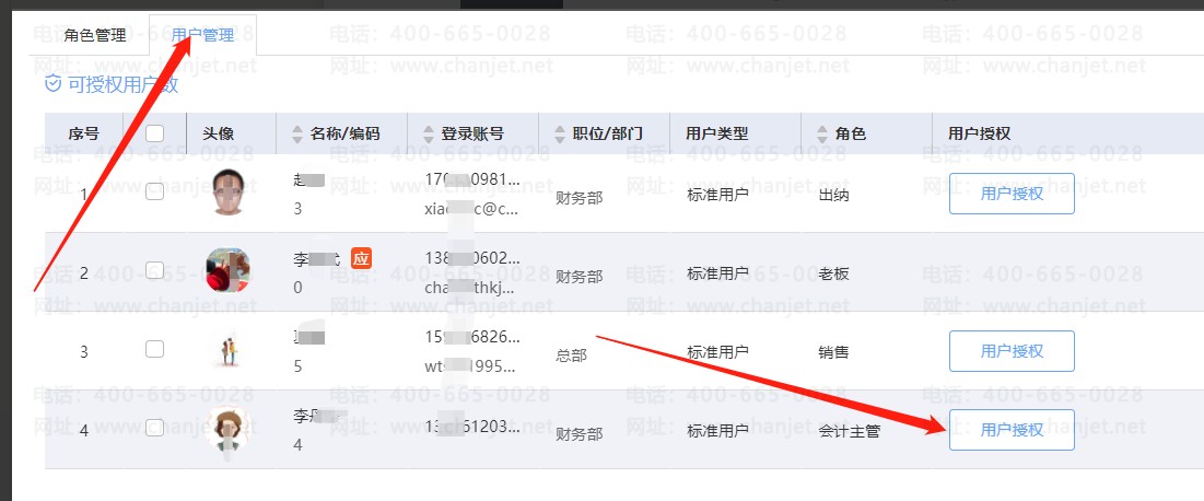 进入【基础信息】-【部门员工】中新增员工信息,之后点击【授权】,选择到相应的角色,之后在【权限设置】-【角色管理】里就能看到。