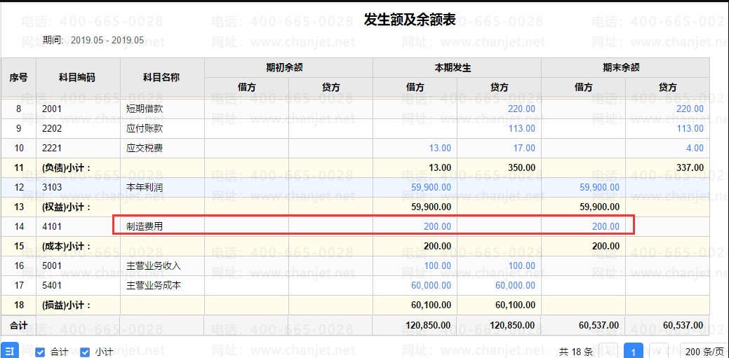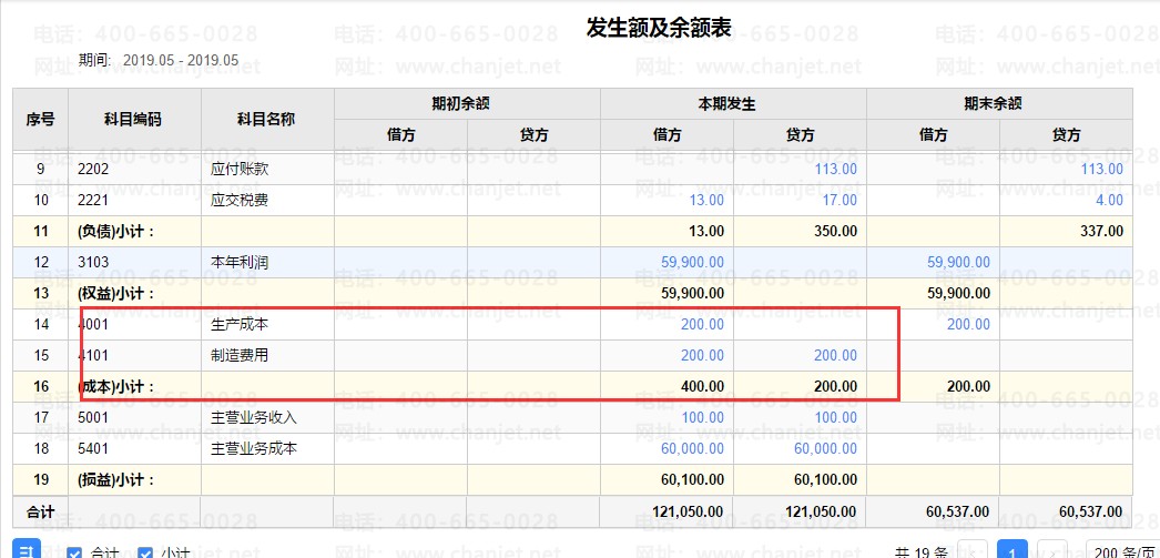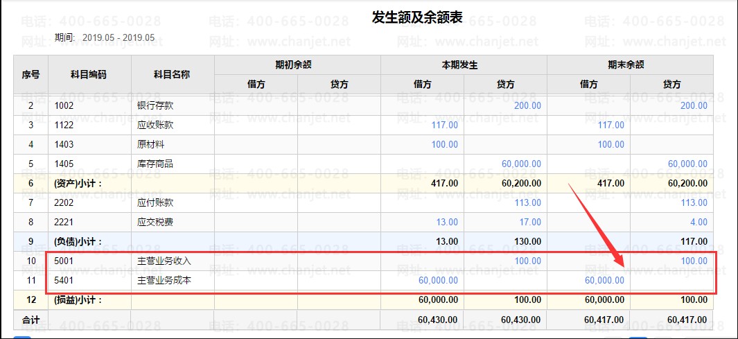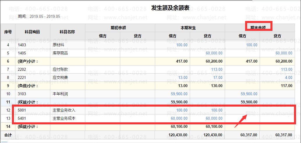 查看科目余额表如果发现损益类科目确实有余额,需要进行期间损益结转生成凭证后记账,再去试算查看报表结果。