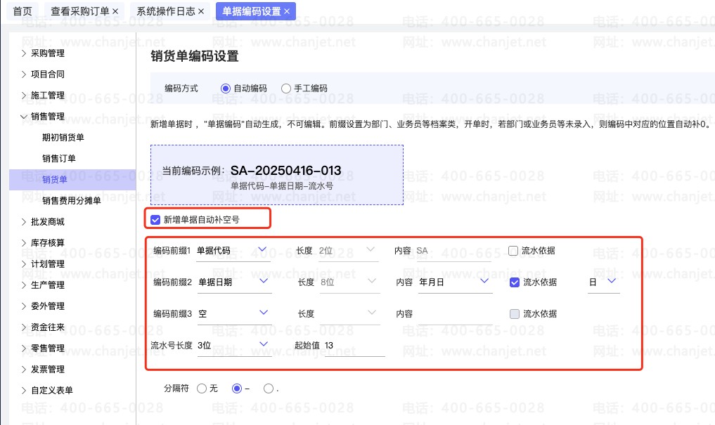 拓展:修改新增单据自动补空号、修改编码前缀方案、流水依据同理。单据补空号都会在修改时间点之后的单据生效。