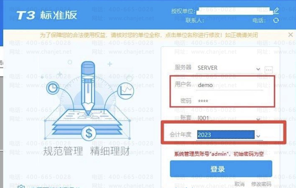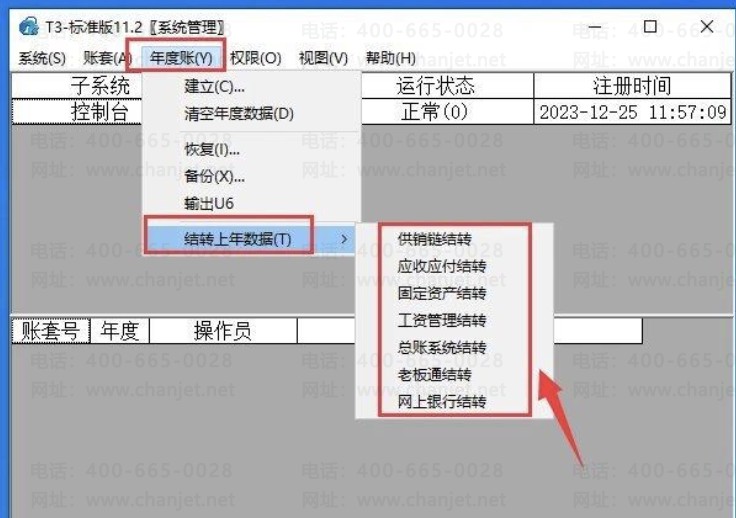 2、新建年度账:使用账套主管的账号(一般为登录用友T3的用户,或者使用demo,密码大写DEMO) 登录系统管理,选中要结转的账套登陆,选择 2023 年登陆,在年度账下点击建立,等待提示建立年度账成功。