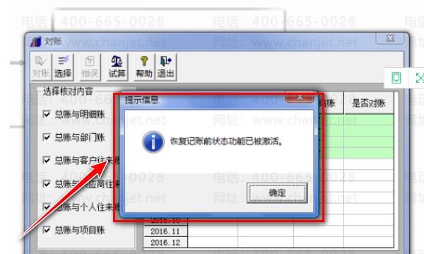 3、然后我们点击"Ctrl+H"按钮,弹出提示信息“恢复记账前状态已被激活”。
