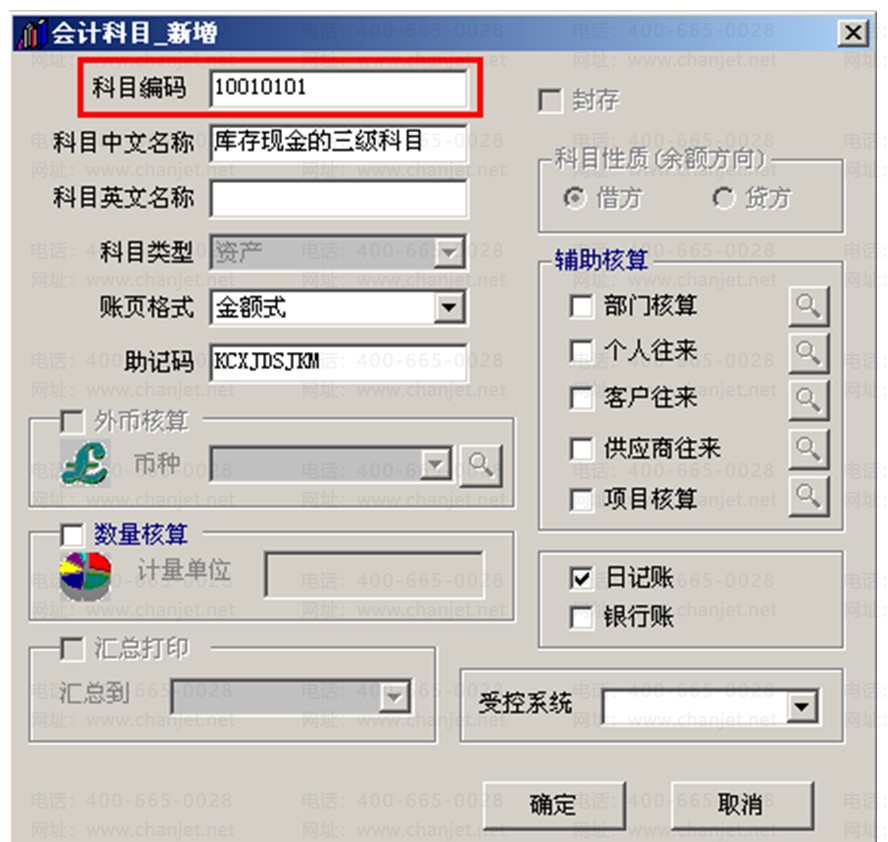 (3)点击“确定”后,会计科目3级科目的编码就是XXXX-XX-XX前面4位是1级科目,中间两位是2级科目,最后两位是3级科目,例:库存现金的三级科目科目编码为:10010101。
