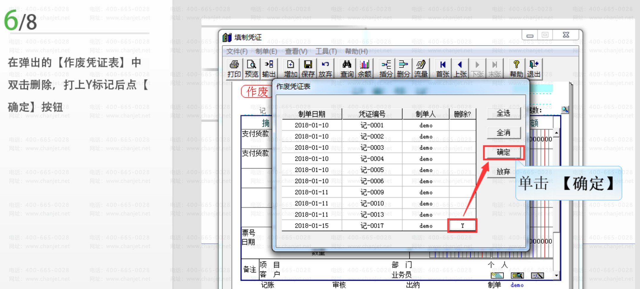 步骤六:在弹出的【作废凭证表】中双击删除,打上Y标记后点击【确定】