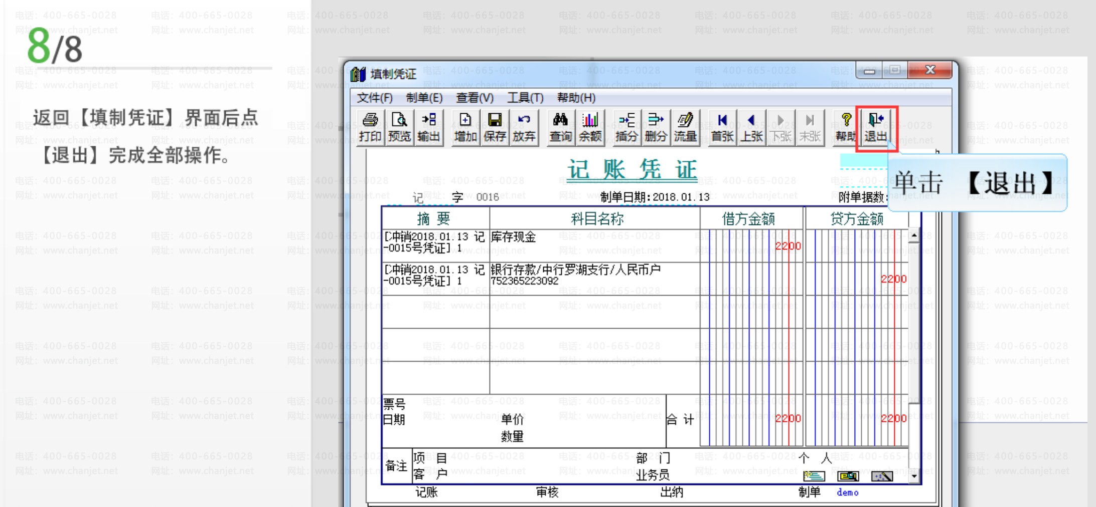 步骤八:返回填制凭证操作界面,点击【退出】,完成用友T3软件凭证的作废、删除的操作。