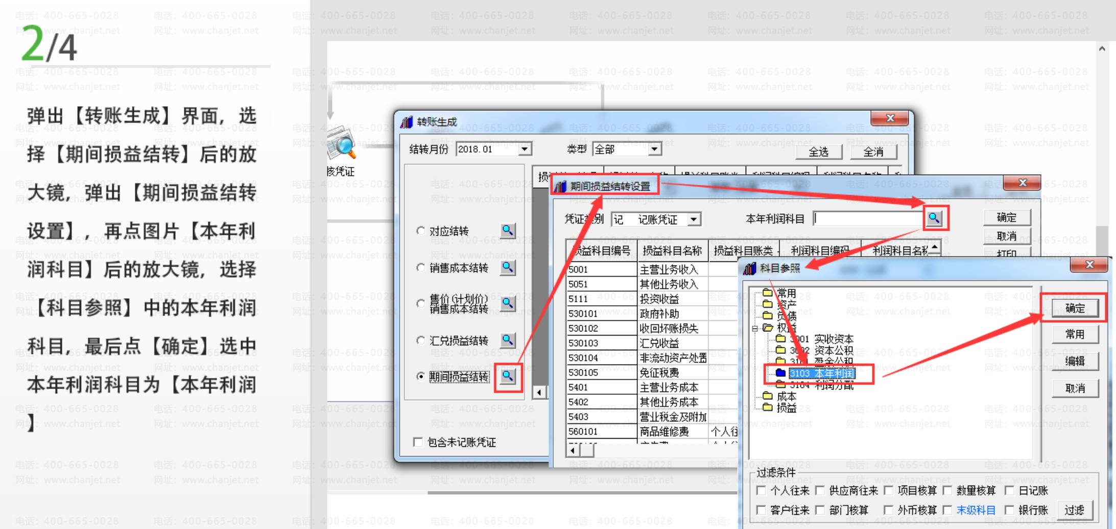 步骤二、弹出【转账生成】界面,选择【期间损益结转】后的放大镜,弹出【期间损益结转设置】,再点图片中【本年利润科目】后面的放大镜,选择【科目参照】中的本年利润科目,最后点击确定选中本年利润科目为【本年利润】