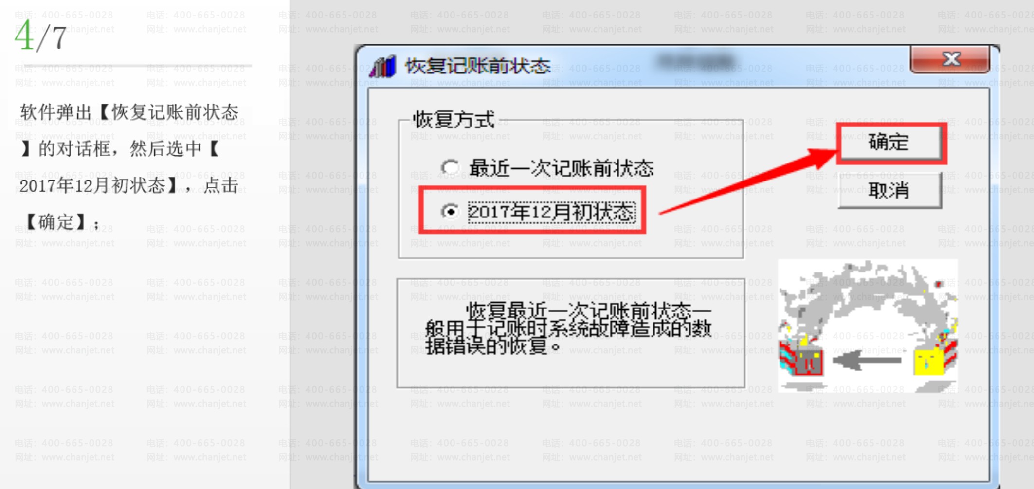 步骤四:软件弹出【恢复记账前状态】的对话框,然后选中2017年12月初状态(注意,一般是从最后一个月往前反记账),点击确定