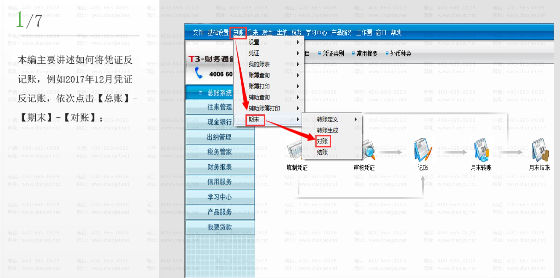 步骤一、我们以2017年12月份凭证为例进行反记账,点击总账菜=》期末=》对账