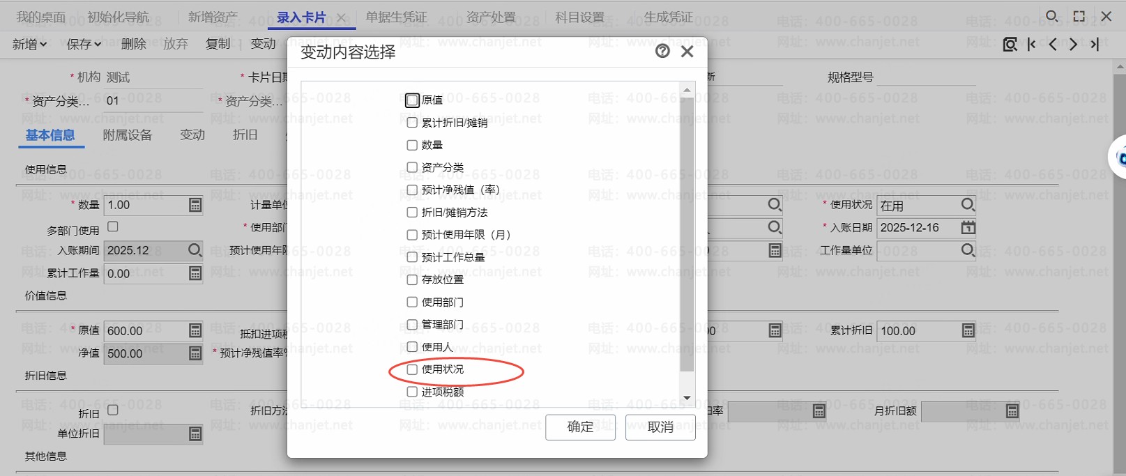 ①若需要卡片在做资产处置的时候本月计提字段可以修改的话,那么需要先做变动单(若卡片是计提了折旧的,无法直接在卡片上直接改,就需要做变动单变动使用状况去勾折旧),变动使用状况,把折旧的勾勾选上,如下图