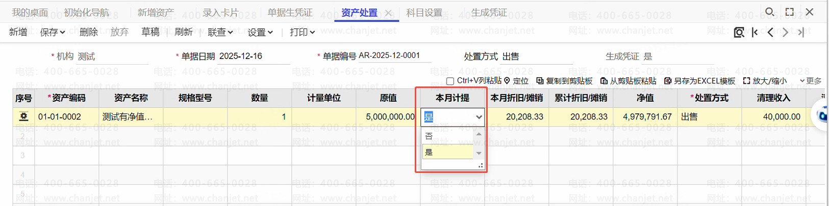 若卡片本身折旧的勾是没有勾选的,那么做资产处置的时候本月计提处无法修改,默认显示的就是否。