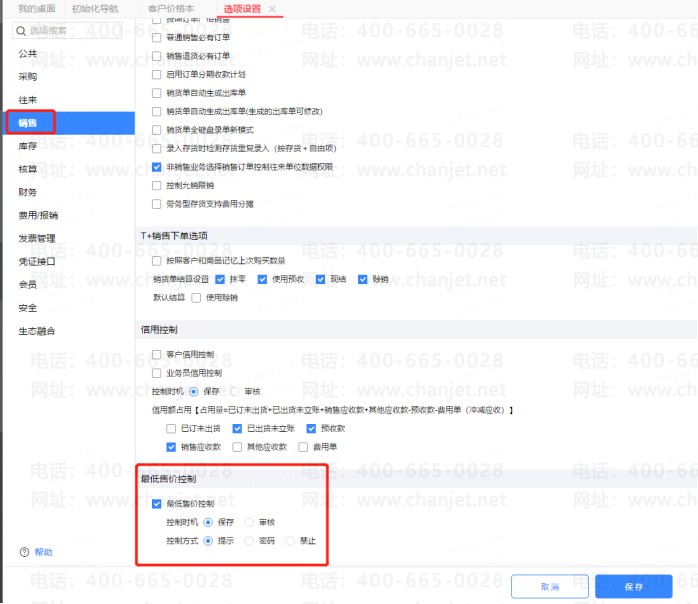 2、系统管理-选项设置 销售页签勾选最低售价控制,设置控制时机和控制方式