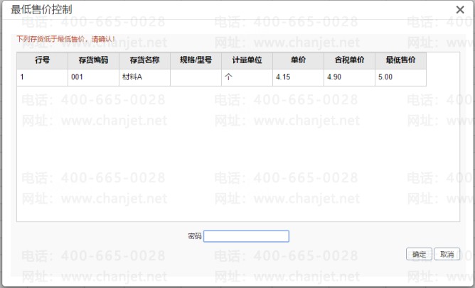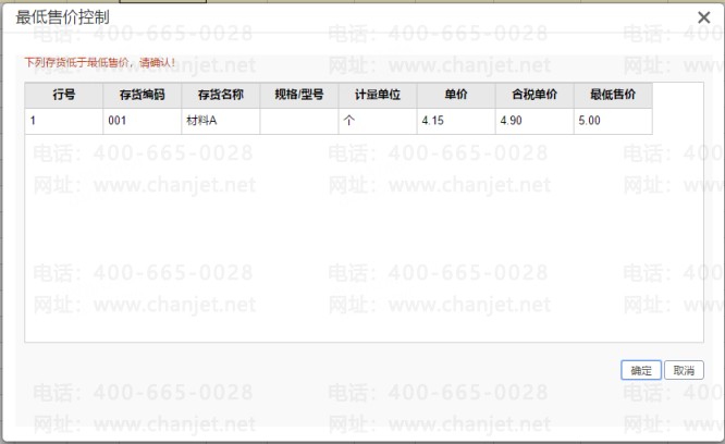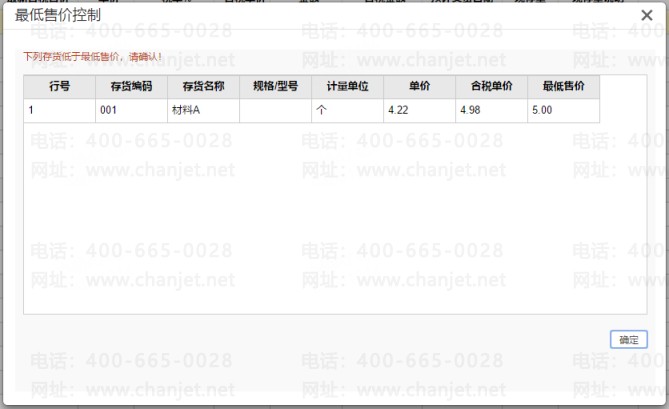 3、填制销售单据时,当售价高于了最低售价(存货最新进价)时系统会自动弹出提示