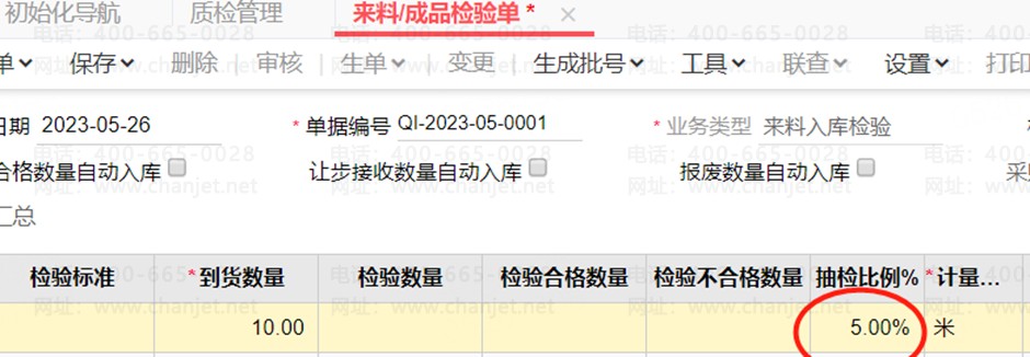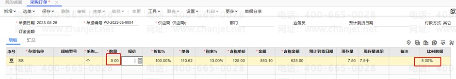 4.这样单据直接输入数量字段5,自定义项的【比例数据】字段就会自动带出5%。