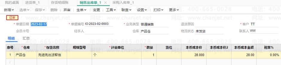 2.1 对应查询成本出入库跟踪,对应的入库单成本刚好是对应做的出库单进行成本出库,出库了一个,出库成本28。