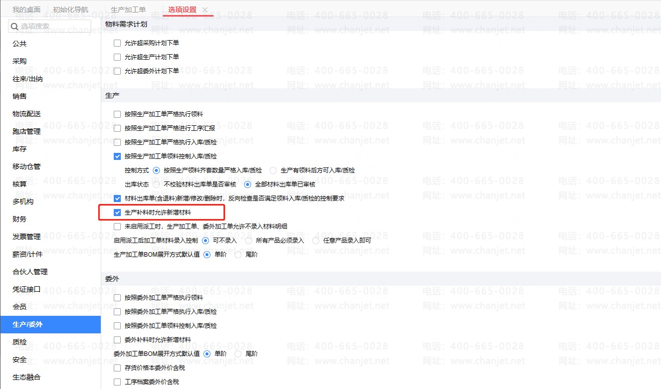一.【系统管理】-【选项设置】-【生产/委外】勾选【生产补料时允许新增材料】