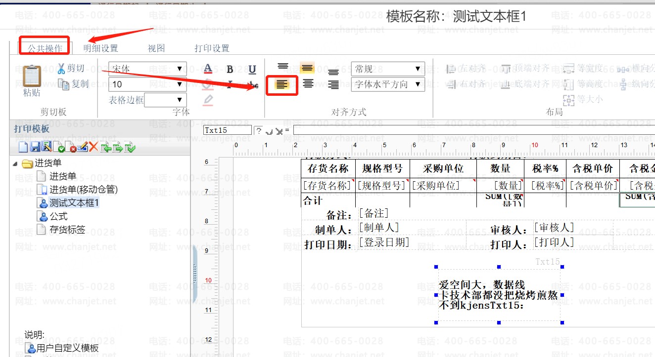 1、在【公共操作】-【明细】-【文本框】内插入文本框后,选中文本框。