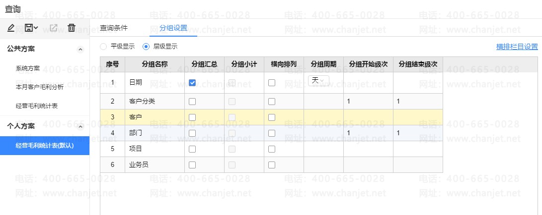 查询经营毛利统计表时过滤条件【分组设置】里面取消勾选【客户】,可以勾选【日期】,这样就能查询了;