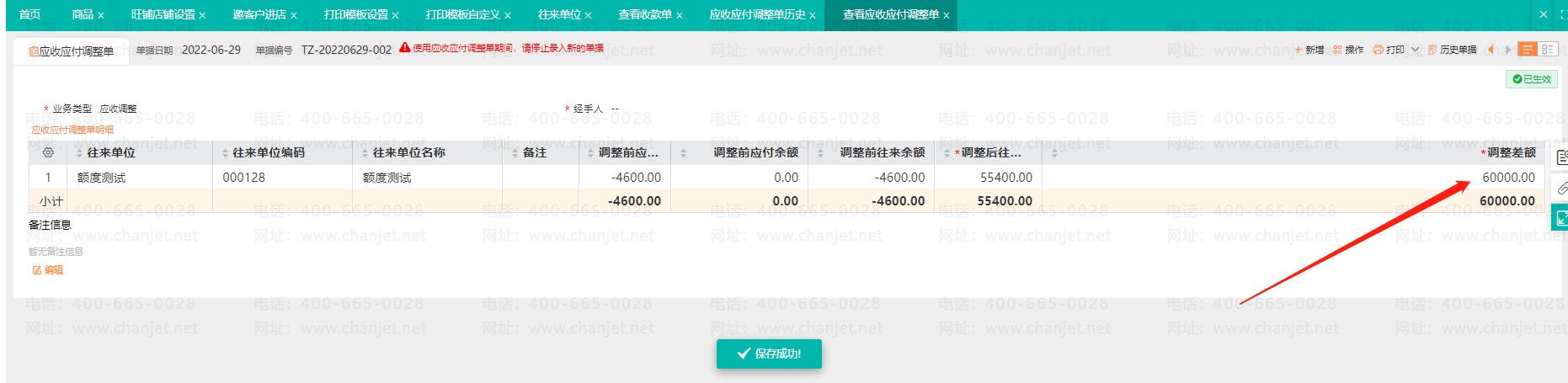 2.点开应收应付调整单,输入调整差额60000,点击保存,会发现没有任何反应。当调整后往来余额超过了信用额度的限制时,单据是保存不了。