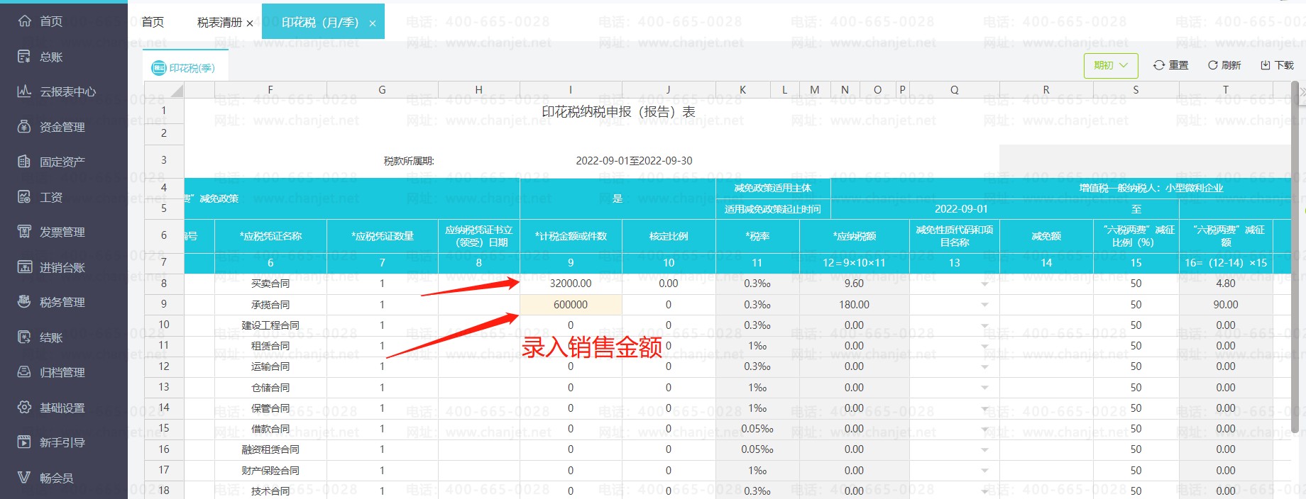 2、录入销售计税金额,核对申报表印花税税额,核对税额无误后保存申报表。