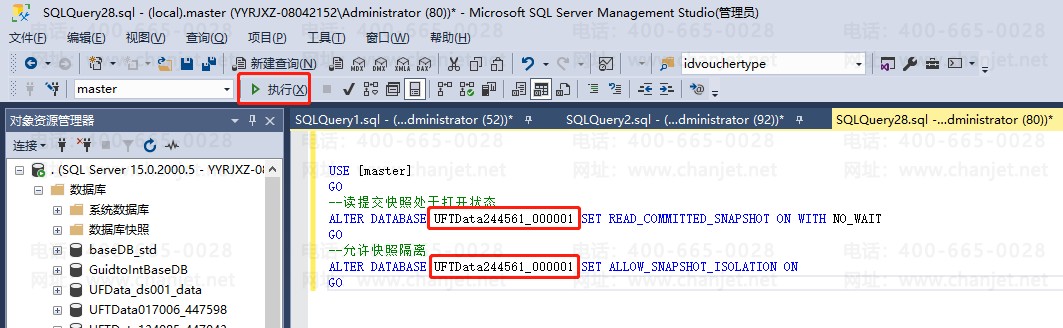 其中[UFTData244561_000001]按T+对应的账套数据库名称进行修改,然后点击执行。