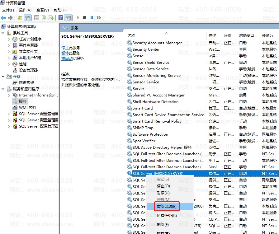点击“开始”—“控制面板”—“管理工具”—“服务”,找到数据库服务SQL Server(MSSQLSERVER),点击右键,将服务重新启动。