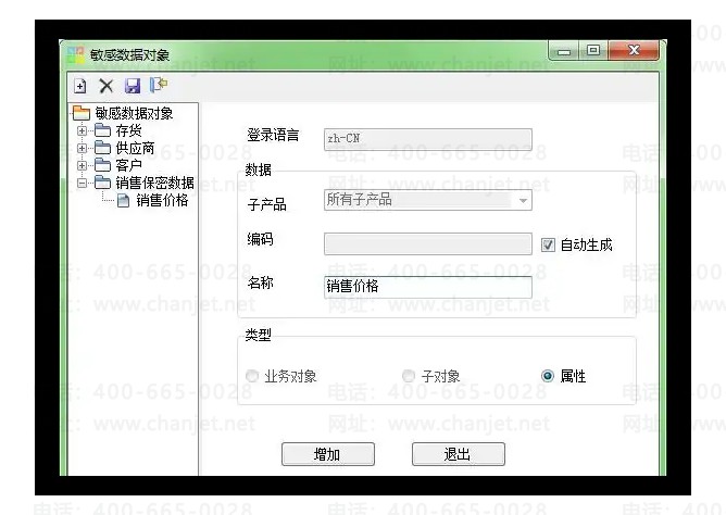 在 “销售保密数据” 这一敏感对象下,点击 “增加”,定义敏感属性名称为 “销售价格”(对应需控制的 “销售单价、金额” 类字段)。