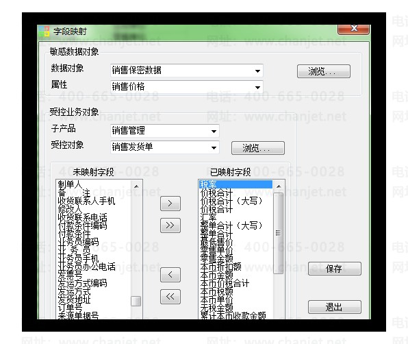 选择子产品【销售管理】,明确需受控的业务对象(如销售发货单、销售发票、销售报表、列表等),将这些业务对象中 “销售单价、金额” 等需控制的字段,从 “未映射字段” 列表移至 “已映射字段” 列表,完成敏感属性与实际字段的关联。