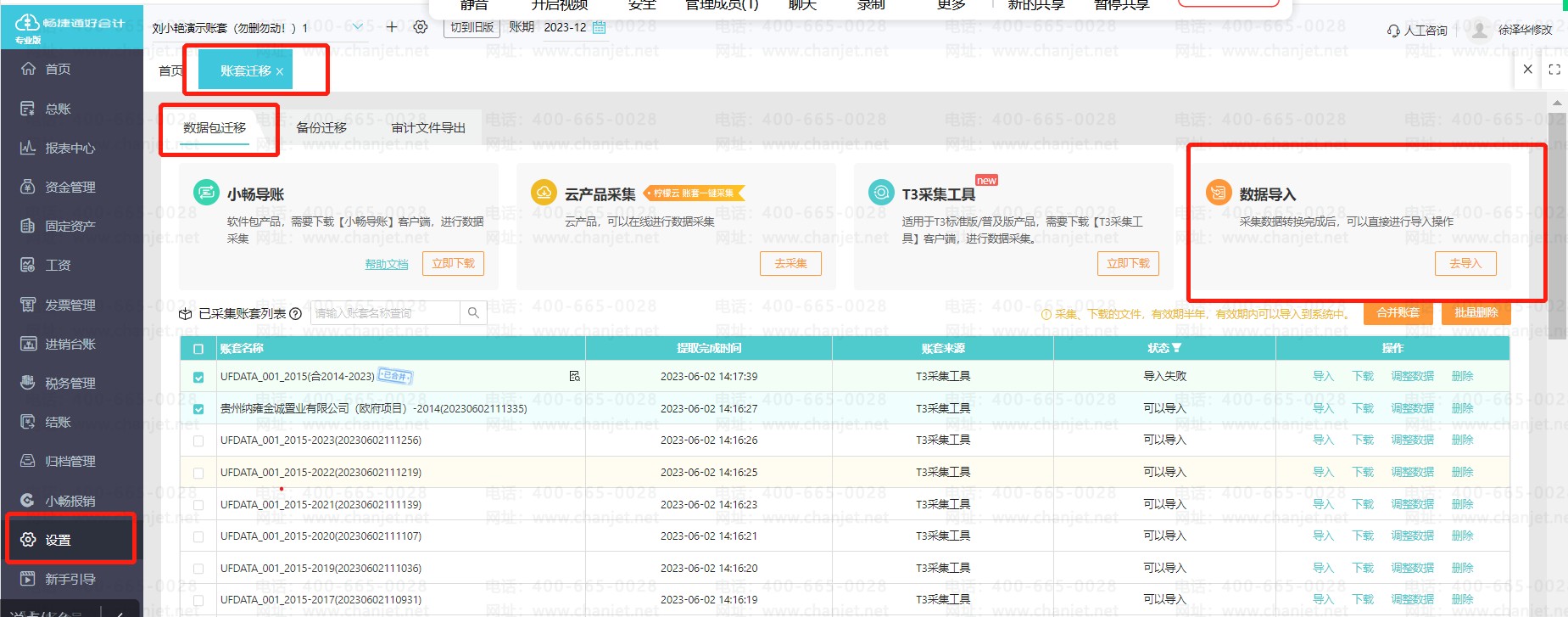 第①步:点击【设置】-【账套迁移】-【数据包迁移】-【数据导入】-【去导入】;
