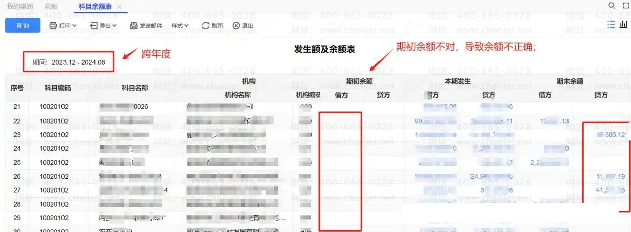 总部查询科目余额表时选了多个机构,再按期间跨年度如2023.12—2024.06,科目余额不对,如1002明细科目,无期初余额,导致查到余额都不对。查询2024.01—2024.06期间余额正确的,单独按机构跨年查询余额也是正确的,勾选了多个机构跨年查询余额不正确。