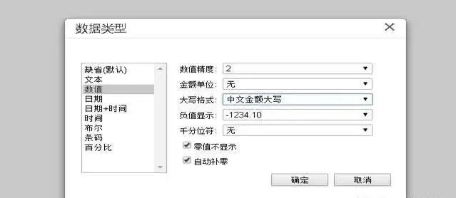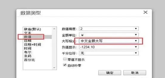 进入数据类型界面,点击数值,可以看到数值中有个“中文大写”,选中后点击确定即可,如图下: