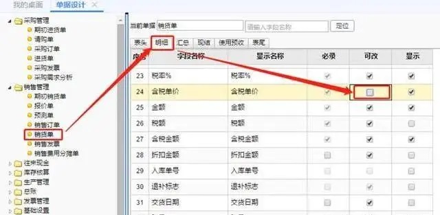 4、进入单据设计界面,找到销售管理-销货单,点击“明细”页签中的“含税单价”,把其对应的“可改”字段的勾取消掉,建议把含税金额的勾也取消掉,如图下: