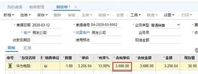 1、首先提前设置好商品单价,如图下存货,华为电脑单价为3680