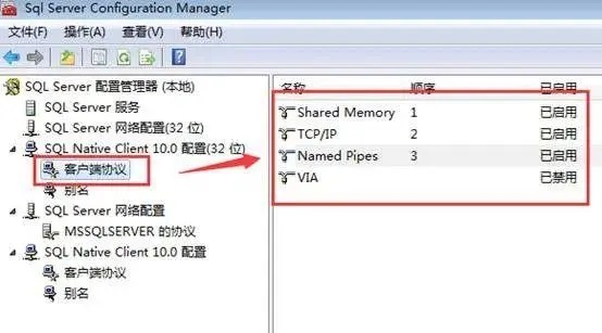 2、点击“SQL Native Client配置”-“客户端协议”,如下图,除了VIA为已禁用,其他三个协议全部右键选择为已启用。