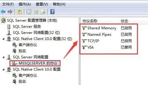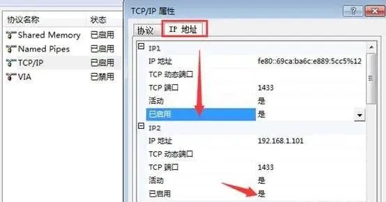 3、启用TCP/IP协议,并且双击进去查看默认端口是不是1433,改为“启用”状态,然后再选择“SQL Server网络配置”-“MSSQLSERVER的协议”,除了VIA为已禁用,其他三个协议全部右键选择为已启用