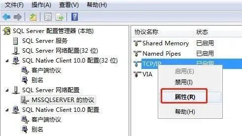 4、同时要设置其中的TCP/IP,右键TCP/IP,选择属性,如图下: