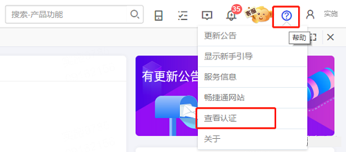 畅捷通T+产品,在做完企业认证后,在登录各个账套后,右上角的【帮助】位置,都可以看到【查看认证】按钮,进而点开后,可以看到认证的企业名称。