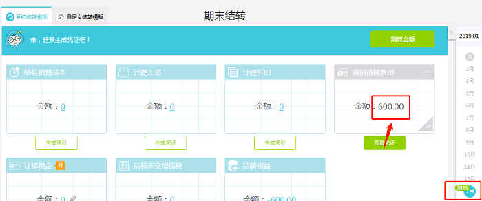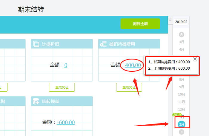 1.在【结账】—【期末结转】处日期选到1月份,点击【测算金额】,可以看到1月份的摊销待摊费用的凭证默认是取的长期待摊费用贷方发生600的那张凭证