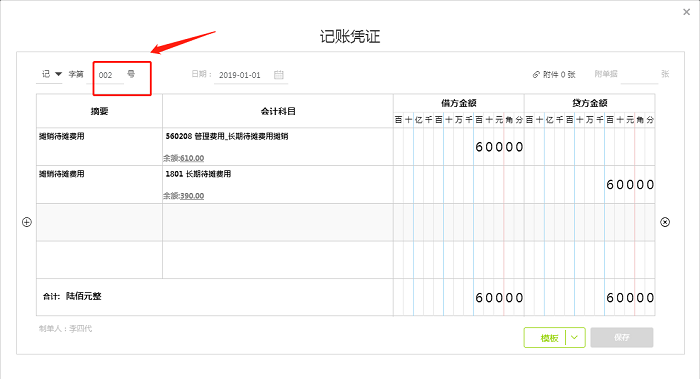注意:1月份存在多张摊销待摊费用凭证的时候,系统默认是显示最后一张摊销凭证,显示的为003号凭证,金额为“长期待摊费用”贷方发生额