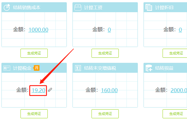 如上图,点击测算金额后,计提税金模板上面的金额为19.2,金额19.2是由应交税费-应交增值税科目明细账贷方发生额320-借方发生额160得出的余额160*12%得来,此处因应交税费—未交增值税科目余额为0,所以一般纳税人计提税金金额取数原理为应交税费-应交增值税贷方余额*税率