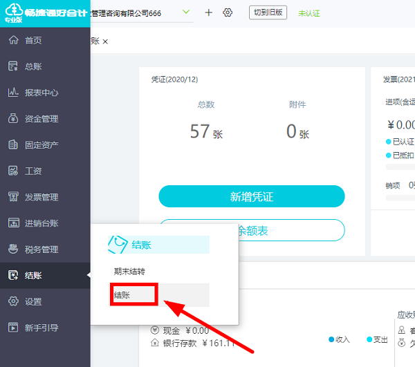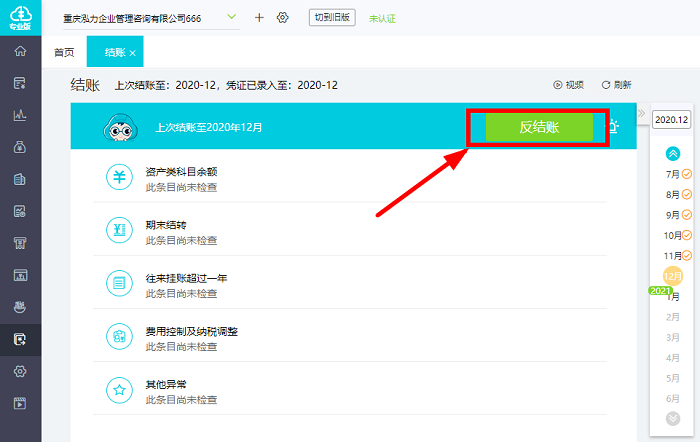 2. 若发现已经结账的月份录入的记账凭证有错误时,点击【结账】-【反结账】即可取消结账,修改错误凭证。