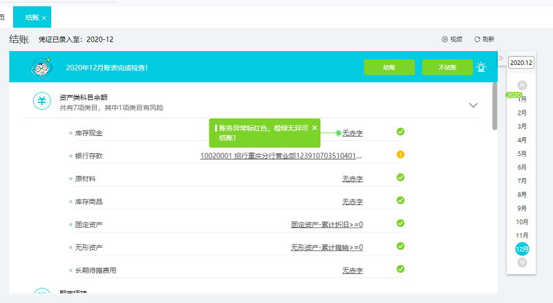 1. 点击左侧菜单【结账】-【结账】,好会计会检查该月的账表,检查是否有财务风险的情况,账务异常标红色则无法结账,橙色绿色没有异常可以一键结账,并且能直接定位错账数据,简单操作直接修改,极大减少财务结账核对的时间;