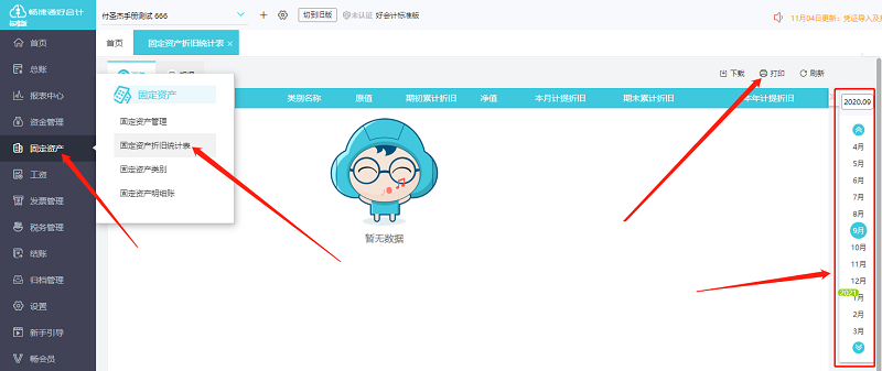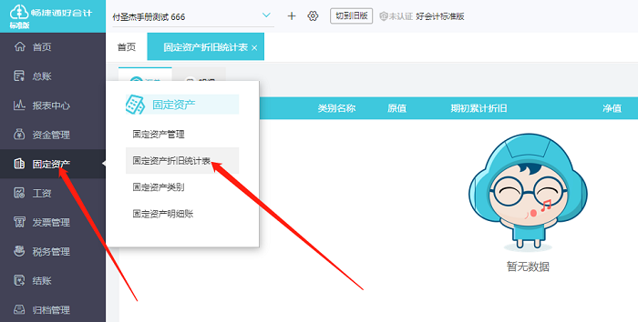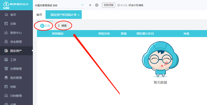 点击【固定资产】模块,再点击【固定资产折旧统计表】,可以查看固定资产折旧的【汇总】或【明细】。如下图所示:
