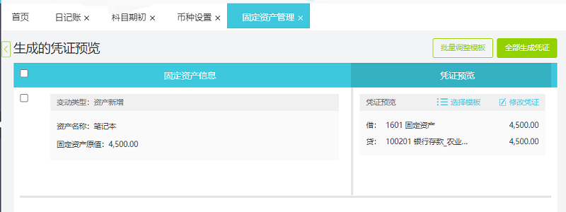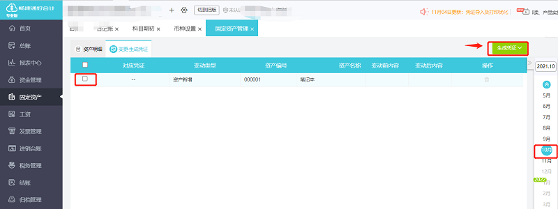 点击【固定资产-固定资产管理】,在“变更·生成凭证”页签下,找到同步“资产新增”更新的记录,勾选好,再点右上角【生成凭证】即可。