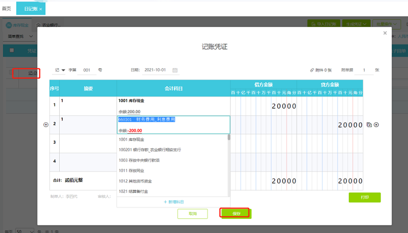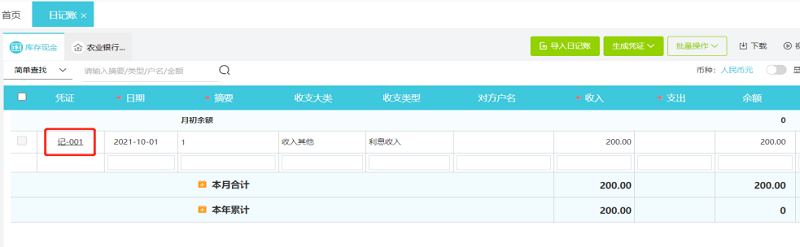 1、点击日记账已生成凭证的凭证号,即可打开对应的凭证修改。