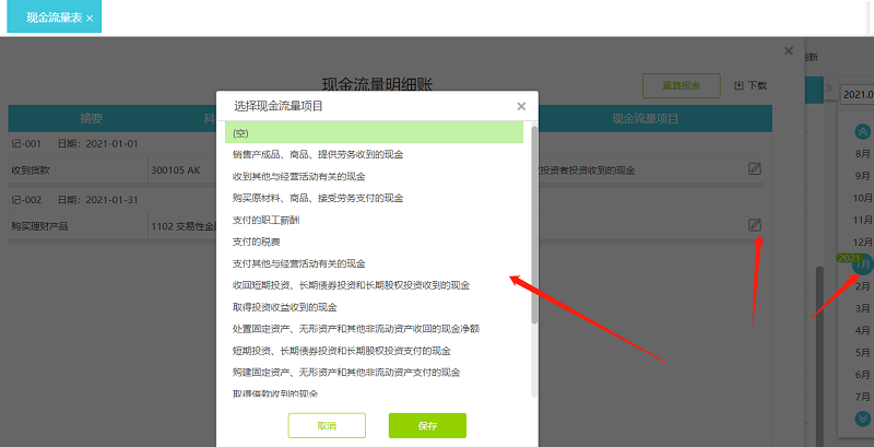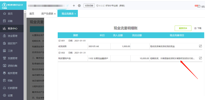 匹配好现金流量名称之后,【报表中心】——【现金流量表】——【明细】,之前涉及每个月的报表需要点重算报表,没有做凭证的月份系统自动匹配现金流量名称