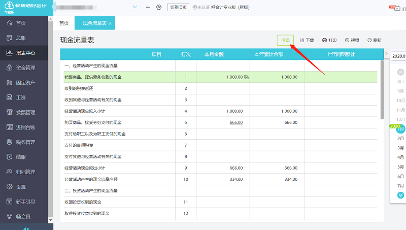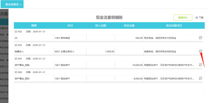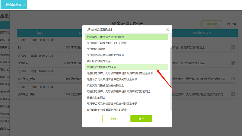 2.如系统匹配“现金流量项目”匹配不正确,可点击现金流量表右上角的明细,进行手动进行修改。如图所示: